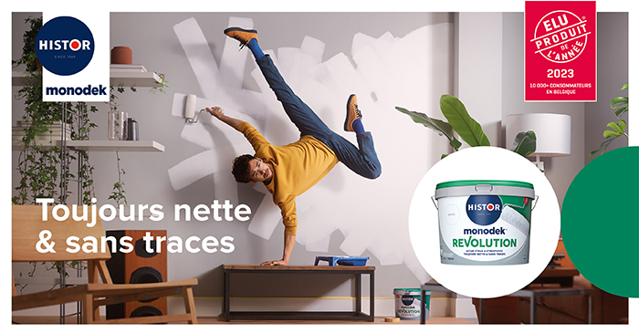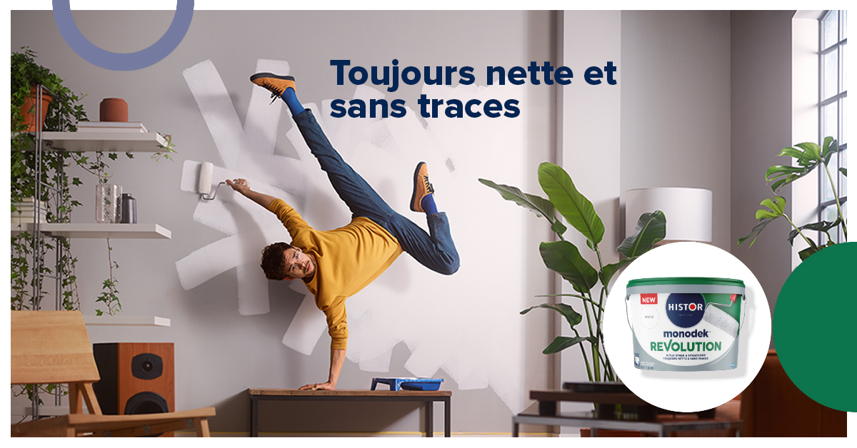 Histor Monodek Revolution, la révolution de la peinture murale : toujours nette et sans traces, peu importe comment vous peignez. Grâce à l’Intelligent Flow Technology , les couches s’enchevêtrent parfaitement les unes dans les autres pendant le séchage, pour un résultat sans traînées ni traces de rouleaux. Un nouveau look pour votre maison.