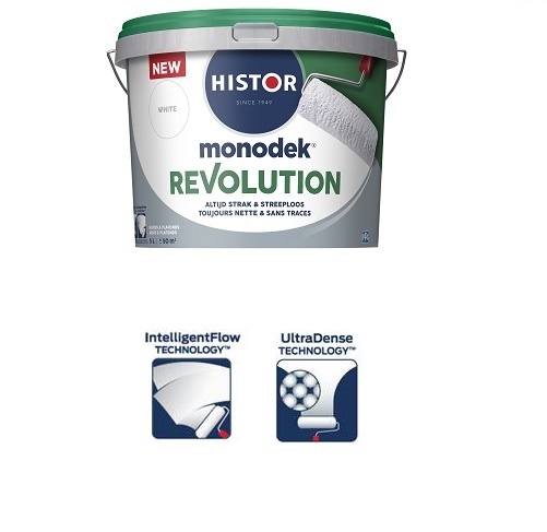 Histor Monodek Revolution, la révolution de la peinture murale : toujours nette et sans traces, peu importe comment vous peignez. Grâce à l’Intelligent Flow Technology , les couches s’enchevêtrent parfaitement les unes dans les autres pendant le séchage, pour un résultat sans traînées ni traces de rouleaux. Un nouveau look pour votre maison.