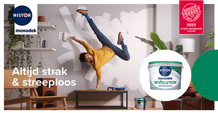Histor Monodek Revolution, de revolutie in muurverf: altijd strak & streeploos, ongeacht hoe je schildert. Door de Intelligent Flow Technology vloeien de verfbanen tijdens het drogen naadloos in elkaar over, voor een resultaat zonder strepen of rollerbanen. Verder zorgt de Ultra Dense Technology voor een hogere dichtheid van de verf en daarmee optimale dekking. Met een stralend witte muur als resultaat. Daar knapt je huis van op.